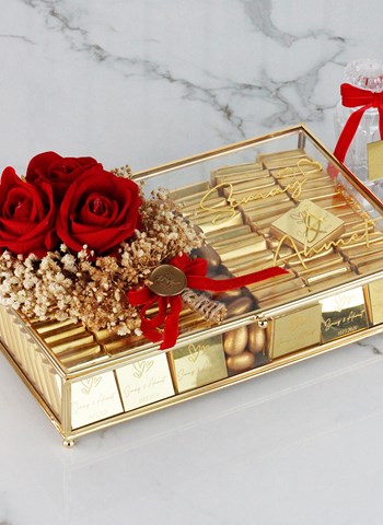 Gül Detaylı Cam Kutuda Söz&Nişan Çikolatası