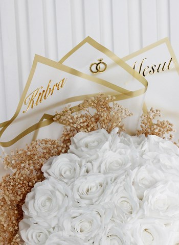 İsme Özel Cam Kutuda Nişan Çikolatası ve 41 'li Beyaz Gül Buketi