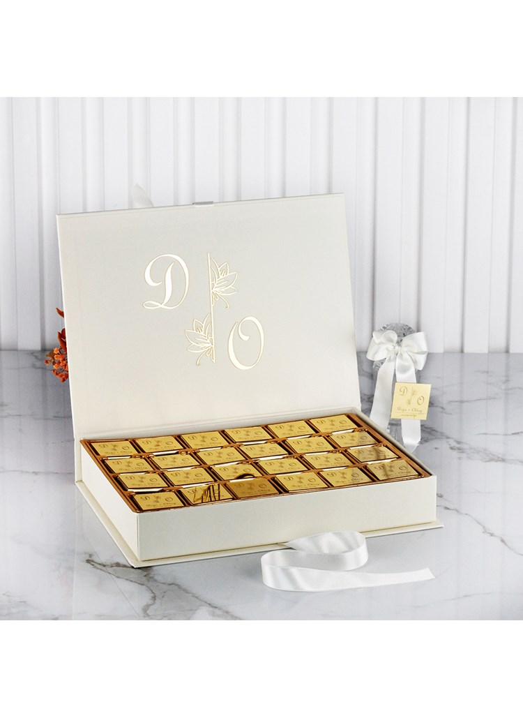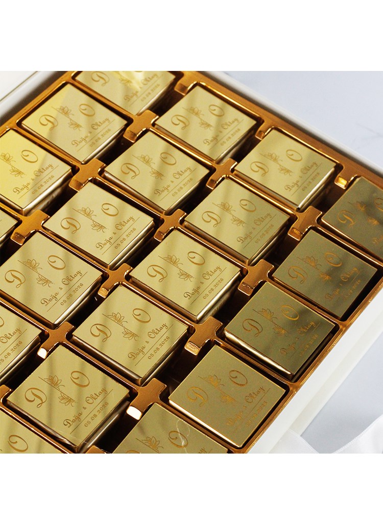 Krem renkli özel kutu içerisinde, gelin ve damadın isimlerine özel olarak hazırlanan çikolatalar; hem estetik bir sunum hem de misafirleriniz için kalıcı bir hatıra sunar. Zamansız ve zarif tasarımı sayesinde nişan masalarına uyum sağlar.