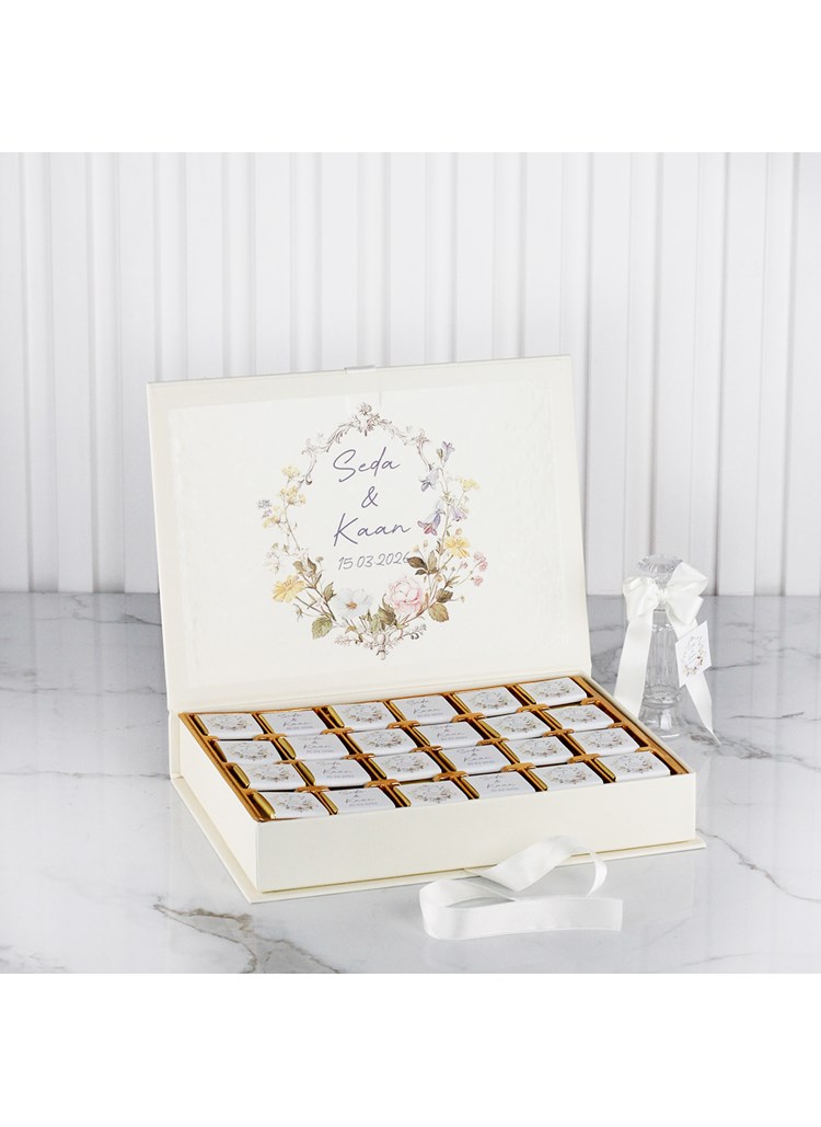 Krem renkli özel kutu içerisinde, gelin ve damadın isimlerine özel olarak hazırlanan çikolatalar; hem estetik bir sunum hem de misafirleriniz için kalıcı bir hatıra sunar. Zamansız ve zarif tasarımı sayesinde nişan masalarına uyum sağlar.