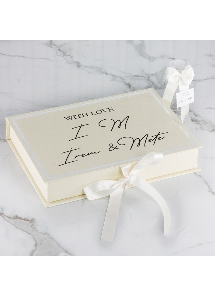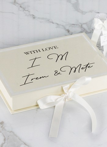 Krem kutu nişan çikolatası, soft rengi ve kişiye özel tasarımıyla nişan törenlerinize şıklık ve anlam katar.