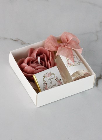 Hayatınızın en özel anlarını hem zarif hem de anlamlı bir hatıra ile taçlandırmak istiyorsanız, kutulu nişan hatırası seti tam size göre. Kalp şeklindeki mumun sıcaklığı, mini cam kolonya şişesinin ferahlığı ve Elit marka sütlü madlen çikolatanın tatlı dokunuşu bir araya gelerek misafirlerinize şık ve unutulmaz bir hediye sunar. Her detay, bu özel günü sevgiyle hatırlatmak için özenle seçilmiştir.