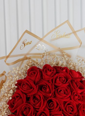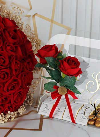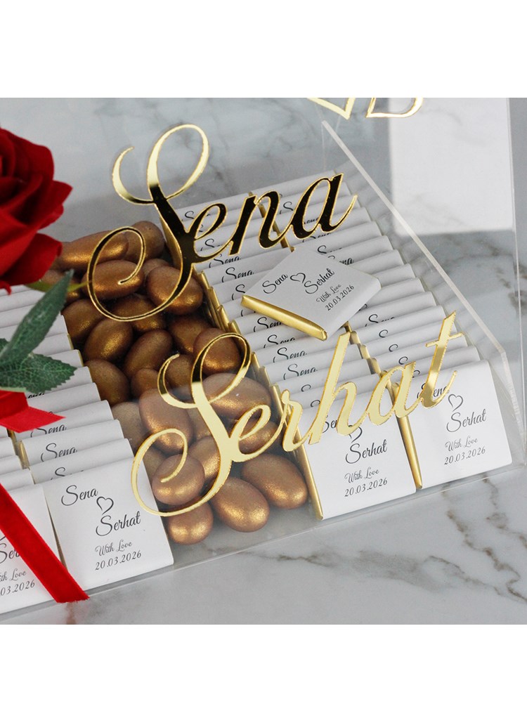 Kişiye Özel Tasarım: Çikolata ambalajları ve gül buketi, gelin ve damat ismine özel olarak hazırlanır.