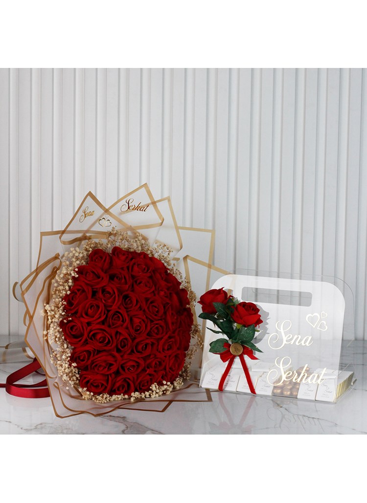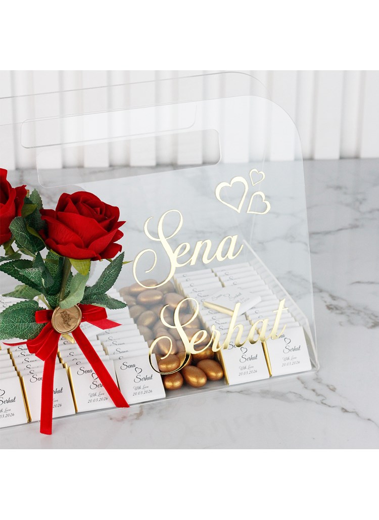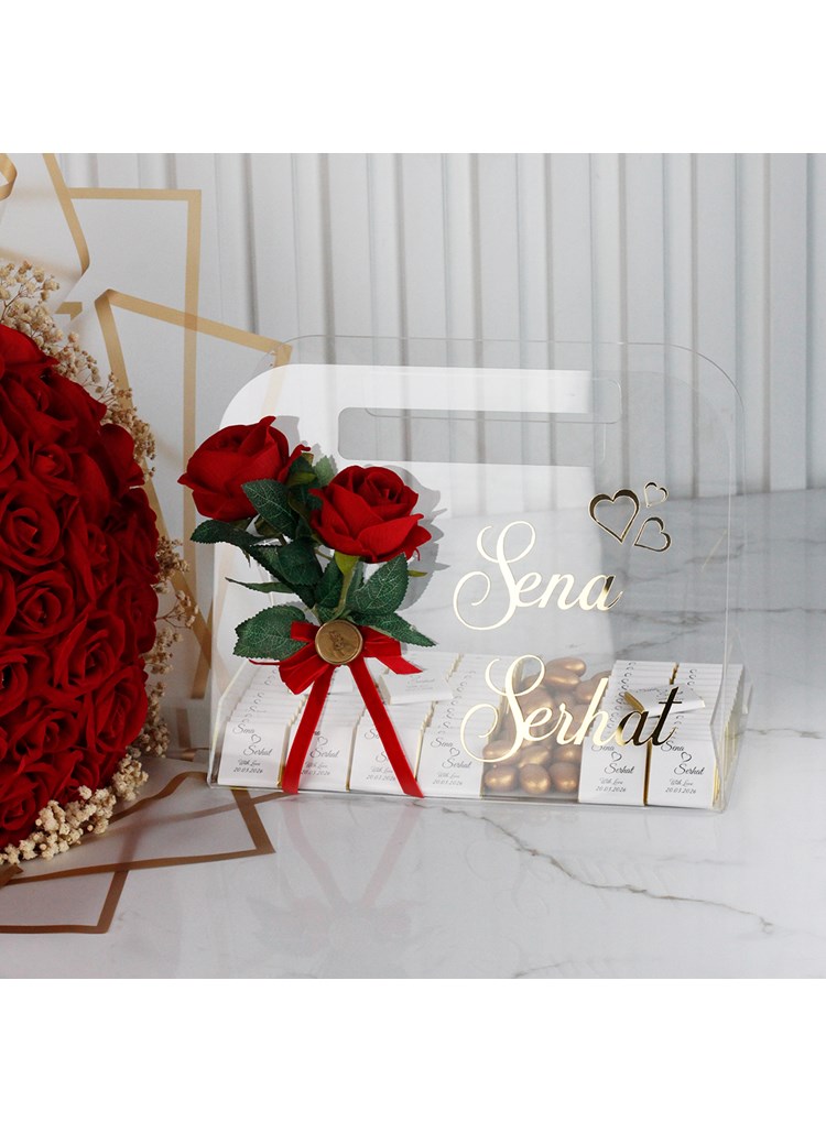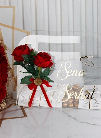 Pleksi Çantada Nişan Çikolatası ve Kırmızı Gül Buketi