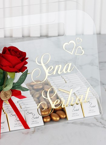 Hayatınızın en özel “evet”lerinden birini zarif detaylarla taçlandırın.Pleksi çantada nişan çikolatası, şık tasarımı ve kişiye özel dokunuşlarıyla nişan törenlerinize unutulmaz bir anlam katar.Pleksi çanta içerisinde, çiftin isimlerine özel tasarlanan çikolatalar; hem göz alıcı hem de kalıcı bir hatıra sunar.