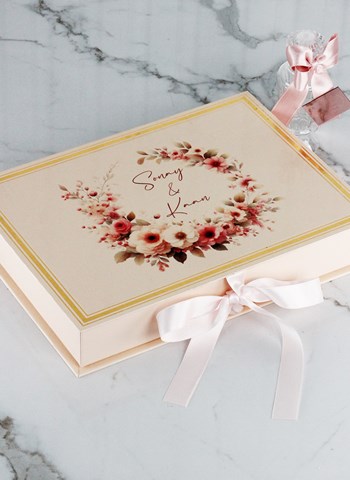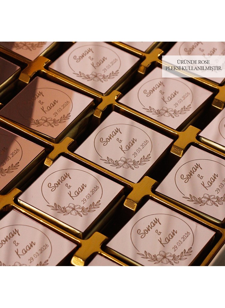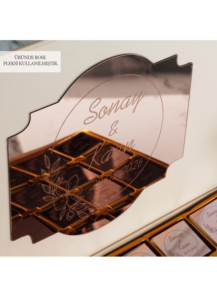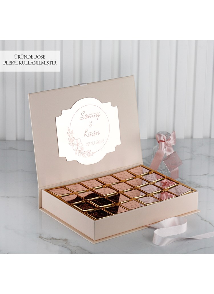 Pudra renkli özel kutu içerisinde, gelin ve damadın isimlerine özel olarak hazırlanan çikolatalar; hem estetik bir sunum hem de misafirleriniz için kalıcı bir hatıra sunar. Zamansız ve zarif tasarımı sayesinde nişan masalarına uyum sağlar.