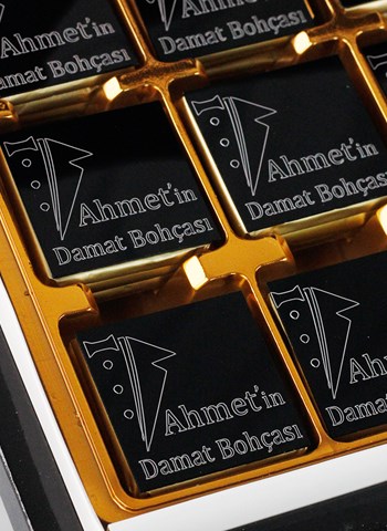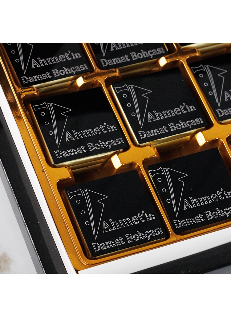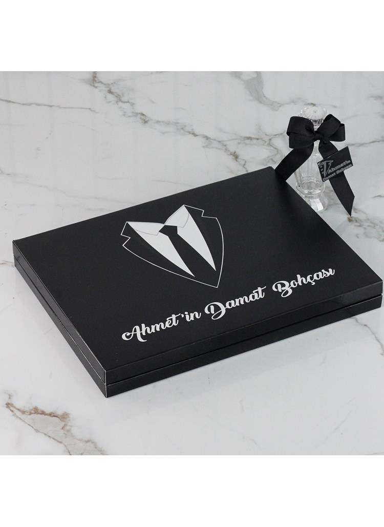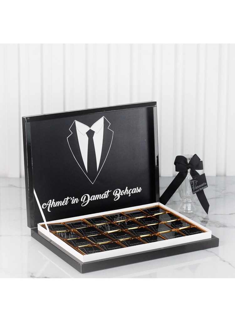 Siyah kutu damat çikolatası, asil siyah rengi ve kişiye özel tasarımıyla damat bohçası ve nişan törenlerine modern bir şıklık katar.