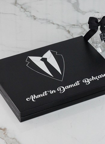 Siyah renkli özel kutu içerisinde, damat ismine özel olarak hazırlanan çikolatalar; hem etkileyici bir sunum hem de misafirleriniz için zarif ve kalıcı bir hatıra sunar. Zamansız tasarımı sayesinde damat bohçası konseptinize kusursuz uyum sağlar.