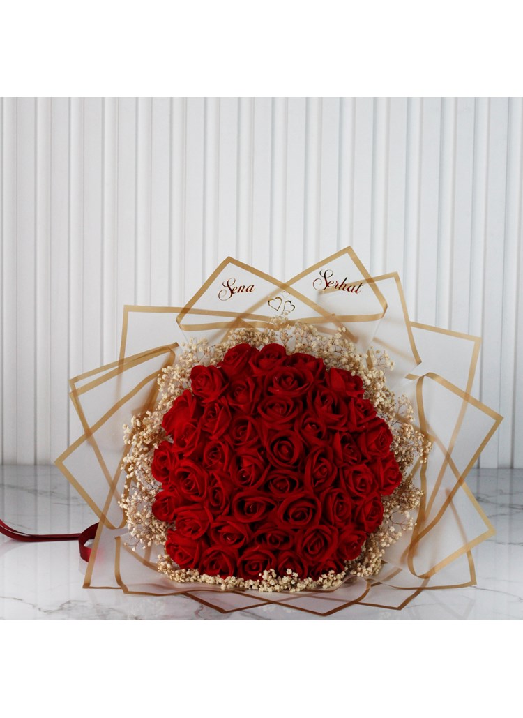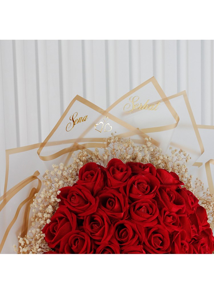 Özenle hazırlanan 41 adet kırmızı gül, şık çerçeve formundaki özel tasarım süsleme ve zarif detaylarla tamamlanarak göz alıcı bir sunum sunar. Hem geleneksel hem modern çizgileri bir araya getiren bu özel buket, isteme merasimleri için kusursuz bir tercihtir.